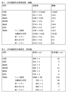 フェリ磁性体の赤外線共鳴周波数と波長は参考文献4.により、表1. 表2に示される。