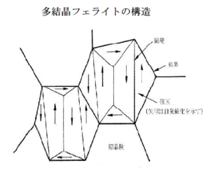 「実際に使用されているフェライトは、前述の単位胞が多数集まって結晶粒子を形成し、更に、この粒子が多数結合 して構成されている。このように多くの結晶粒から構成される材料を多結晶材料と呼ぶ。図1.5に多結晶材料を模型的に示す。この図に示すように、各結晶粒 子は粒界を介して稠密に結合しており、各結晶粒子は、更に小さい磁化を持つ領域から成り立っている。」